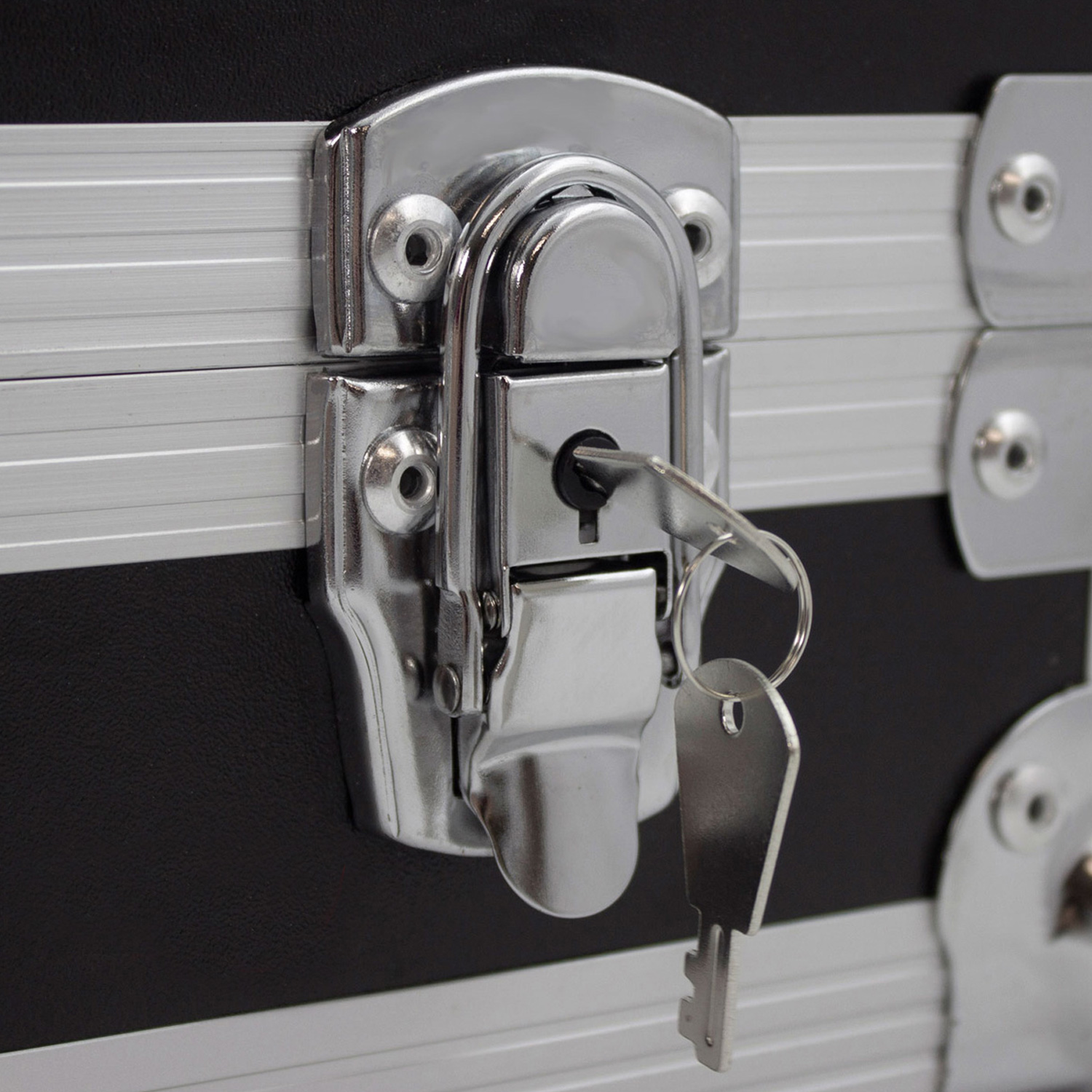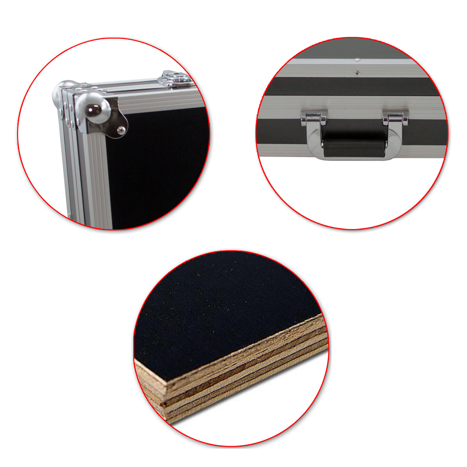 SOLIDE:Der Transportkoffer aus schwarz beschichtetem Holz schützt zuverlässig beim Transport oder Lagerung. Das stabile Flightcase ist aus 7mm Birkenmultiplex gefertigt, mit Alukanten versehen und hat 8 Kugelecken aus Stahl.