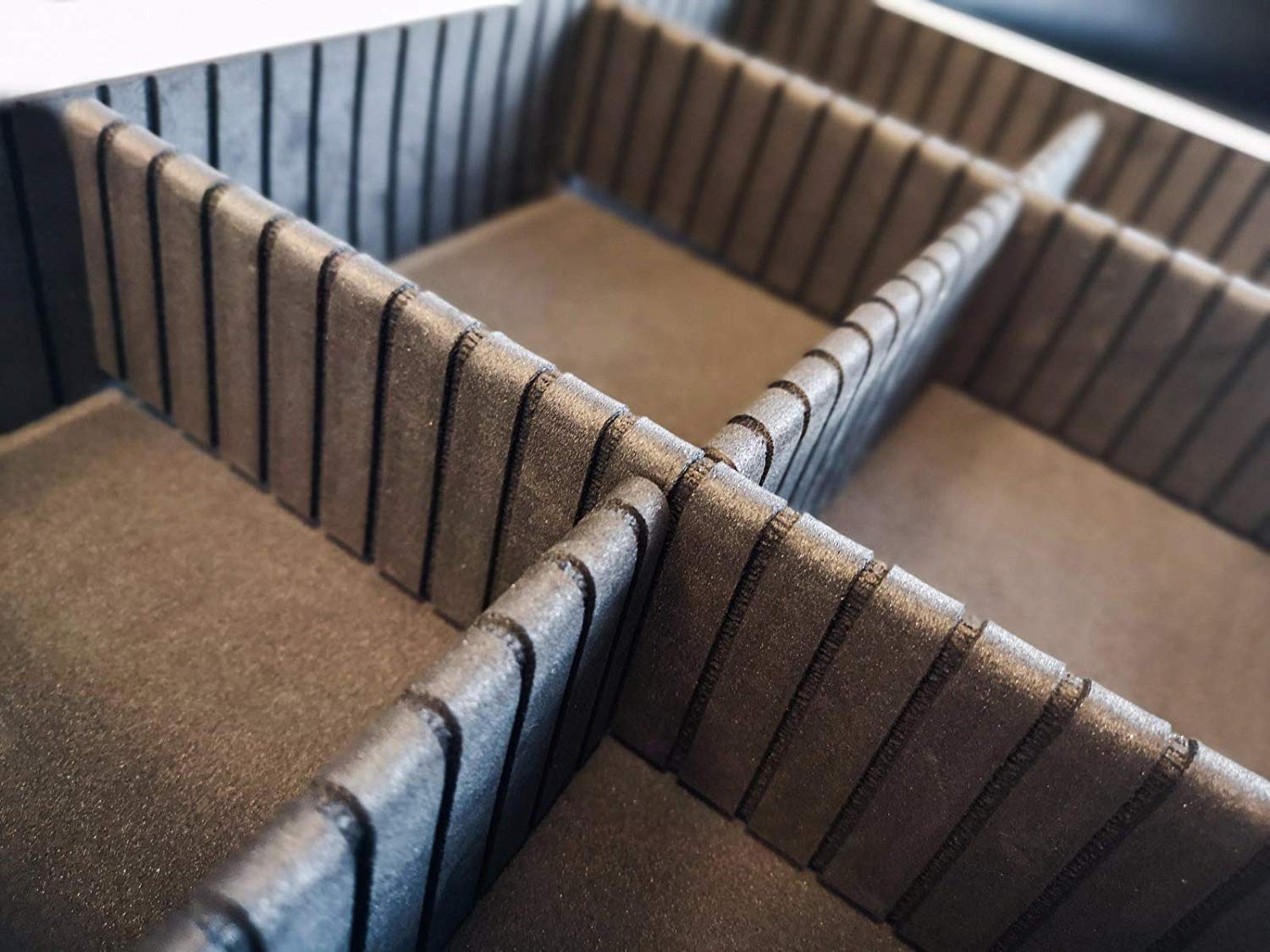 Im Inneren befinden sich verschieden lange Abtrenner, die individuell zusammen gesteckt werden können. Somit kann der Koffer ideal an Produkte angepasst werden. Es lässt sich damit z.B. ein Abteil für Zubehör zu einem Gerät bauen oder Kleinteile übersichtlicher sortieren.