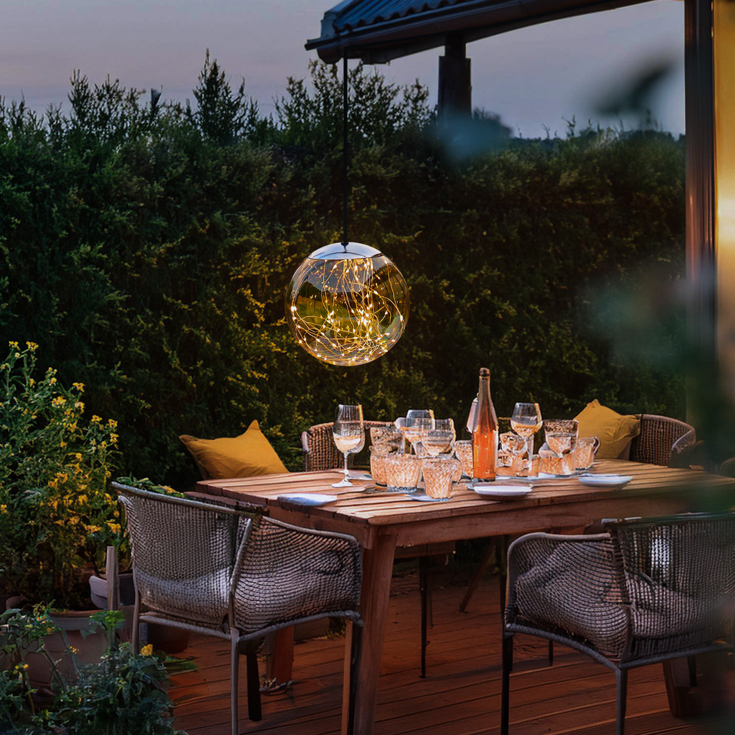 Dank des praktischen Kabelanschlusses kannst Du die Kugel dauerhaft und zuverlässig zum Strahlen bringen. Ob im Wohnzimmer, im Wintergarten oder auf der festlich gedeckten Tafel, ob auf Terrasse, Balkon oder im Garten - überall entfaltet sie ihren stilvollen Charme und hüllt den Raum in ein stimmungsvolles Licht.